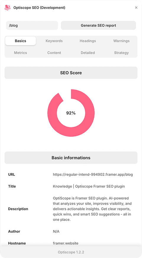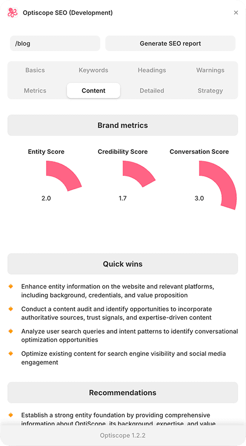 OptiScope meticulously scans your site’s core elements to ensure nothing is missed. It automatically analyzes: Headings, Images, Meta Tags, and more...